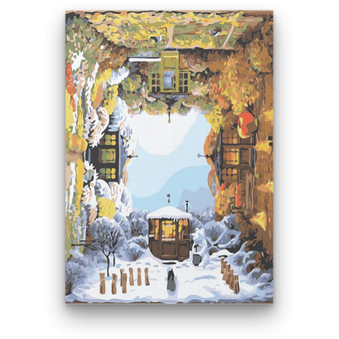 Ház Négy Évszakban - számfestő készlet – 40×50 cm (Keret nélkül) A festmény varázslatos téli hangulatot áraszt, amely egy csendes, hóval borított tájat tár elénk. A kép mesés történetet sejtet, ahol a természet és az ember alkotta világ harmóniában létezi