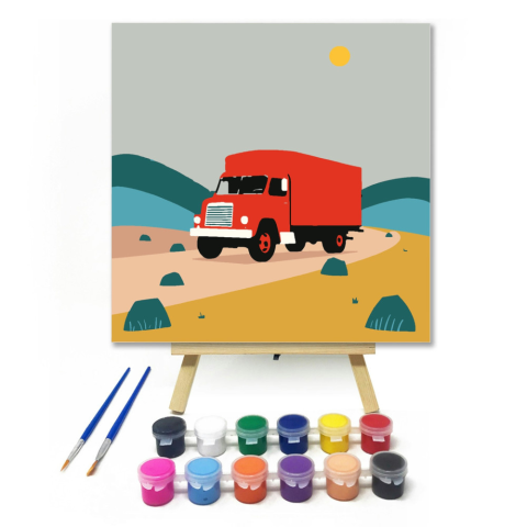 Hegyek között utazva - gyerek számfestő készlet – 20×20 cm (Keret nélkül) Ez a kép egy vidám, piros teherautót ábrázol, amint a hegyek között kanyarog egy napos úton. A színes táj és a mosolygós napocska kalandra hívja a kis művészeket. Tökéletes választá