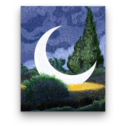Hold - számfestő készlet – 40×50 cm (Keret nélkül) Ez a festmény egy misztikus éjszakai világba repít, ahol a holdfény sejtelmes ragyogása öleli körül a tájat. A kép mesés történetet sugall, mintha egy álomszerű táj elevenedne meg előttünk. A kék és zöld