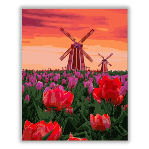 Hollandia - számfestő készlet – 40×50 cm (Keret nélkül) A festmény meleg, nosztalgikus hangulatot áraszt, amely egy békés tavaszi délutánra emlékeztet. A szélmalmok és a tulipánok harmóniája egy régmúlt történetet mesél el, ahol a természet és az ember ké