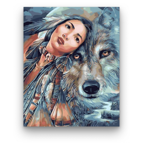 Indián lány és farkas - számfestő készlet – 40×50 cm (Keret nélkül) A kép varázslatos, misztikus hangulatot áraszt, amely azonnal megragadja a néző figyelmét. Egy történet bontakozik ki előttünk a természet és az ember közötti mély kapcsolatról. A hűvös k