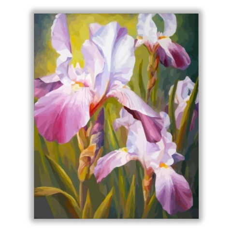 Íriszek - számfestő készlet – 40×50 cm (Keret nélkül) A festményen látható íriszek nyugalmat és eleganciát sugároznak, mintha egy titokzatos kertben járnánk. A virágok finom hajlatai egy történetet mesélnek el a természet megújulásáról és szépségéről. A l