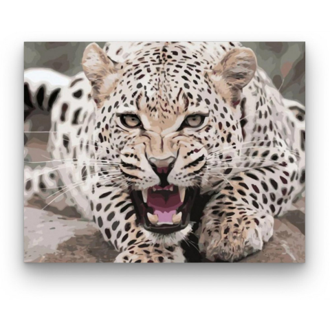 Jaguár - számfestő készlet – 40×50 cm (Keret nélkül) Ez a festmény feszültséggel és energiával tölti meg a teret, ahogy a jaguár tekintete áthatóan figyeli a nézőt. A vadászat izgalma és a természet ereje elevenedik meg, miközben a színek dinamikus kontra