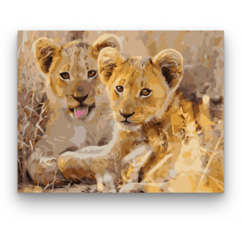 Játékos kisoroszlánok - számfestő készlet – 40×50 cm (Keret nélkül) A festmény két fiatal oroszlán nyugodt és játékos pillanatát ragadja meg, amely az ártatlanság és a természet erejét sugallja. A néző szinte hallja a szavannai szél susogását, miközben a