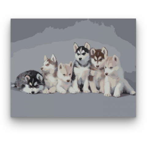 Játszótársak - számfestő készlet – 40×50 cm (Keret nélkül) Ez a festmény a játékosság és az ártatlanság érzését kelti életre. Egy kedves történet bontakozik ki, ahol a kis barátok összebújnak egy közös kaland előtt. A szürke háttér kiemeli a kölykök gyeng