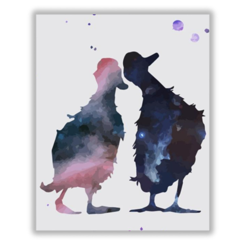 Kacsa pár - számfestő készlet – 40×50 cm (Keret nélkül) Ez a festmény finom romantikát sugároz, mely a nézőt egy csendes, elgondolkodtató pillanatba vonja. A kép két alakjának sziluettje egy meghitt történetet mesél el, ahol a színek és formák összefonódn