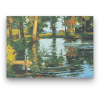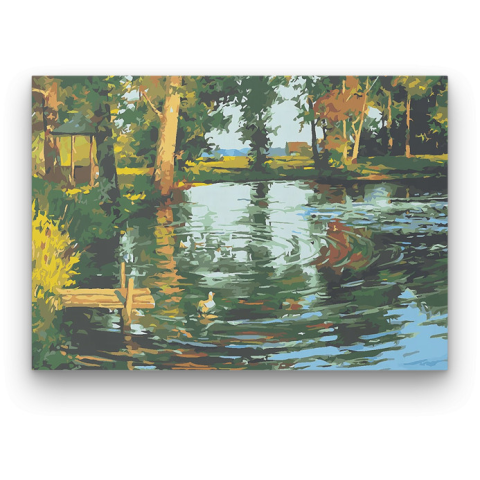 Kacsák a Tónál - számfestő készlet – 40×50 cm (Keret nélkül) A festmény nyugodt harmóniát áraszt, mintha egy csendes tó partján állnánk. A kép mesél egy idilli délutánról, ahol a természet és a víz találkozása békét hoz. A zöldek és kékek dominanciája éle