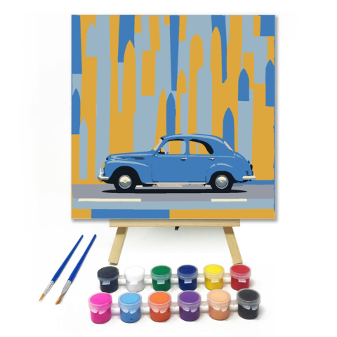 Kék oldtimer - gyerek számfestő készlet – 20×20 cm (Keret nélkül) Ez a kép egy bájos kék oldtimert ábrázol, amely vidáman gurul a színes város utcáin. A sárga és kék árnyalatok izgalmas világot teremtenek, ahol a gyerekek könnyedén elmerülhetnek. Tökélete