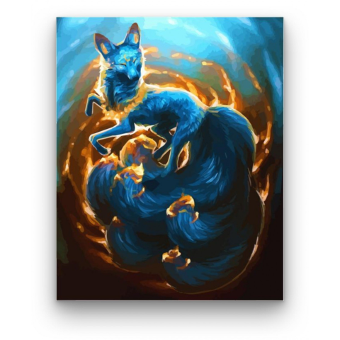 Kék róka - számfestő készlet – 40×50 cm (Keret nélkül) A kép varázslatos hangulatot áraszt, amely azonnal magával ragadja a nézőt. Egy misztikus történet bontakozik ki, ahol a kék róka egy másik világba kalauzol. A kék és narancs színek dinamikus kontrasz