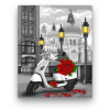 Fehér Vespa - számfestő készlet – 40×50 cm (Keret nélkül) A festmény egy romantikus városi pillanatot ragad meg, ahol a csend és a várakozás érzése keveredik. A fehér Vespa előtt heverő rózsák történeteket mesélnek egy eljövendő találkozásról. A szürke t