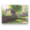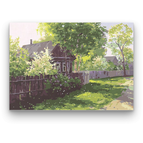 Kertes Házak - számfestő készlet – 40×50 cm (Keret nélkül) A festmény nyugodt, vidéki hangulatot áraszt, amely a természet csendjét idézi. Egy eldugott kis falusi ház meséjét sugallja, ahol az idő megállni látszik. A zöld és barna árnyalatok harmonikus eg