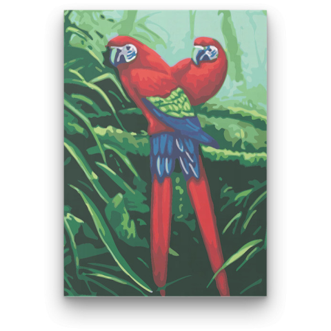 Két Papagáj - számfestő készlet – 40×50 cm (Keret nélkül) A festmény egzotikus hangulatot áraszt, mintha egy trópusi erdő mélyére pillantanánk. A két papagáj közötti kapcsolat mesés történetet sejtet a természet varázsában. A zöld és piros színek kontrasz