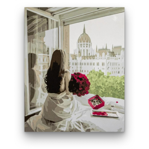 Kilátás a Parlamentre - számfestő készlet – 40×50 cm (Keret nélkül) A festmény nyugodt, mégis inspiráló hangulatot áraszt, amely a nézőt egy csendes reggeli pillanatba repíti. Egy történet bontakozik ki, ahol a városi táj és az intimitás találkozik egy kü