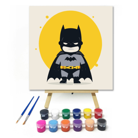 Kis batman - gyerek számfestő készlet – 20×20 cm (Keret nélkül) Ez a kép egy bátor kis denevérembert ábrázol, aki készen áll megmenteni a világot! A naplemente sárga fénye igazán hősi hangulatot varázsol. Tökéletes választás a gyerekek első kreatív kaland