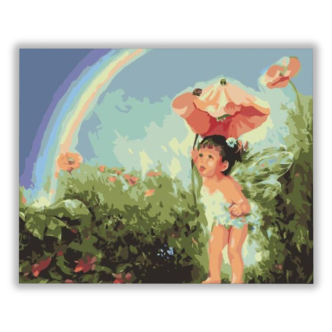 Kis tündér a réten - számfestő készlet – 40×50 cm (Keret nélkül) A festmény varázslatos, mesebeli hangulatot áraszt, amely egy tündérvilágba repíti a nézőt. Egy történet bontakozik ki, ahol a természet és a fantázia találkozik egy szivárványos réten. A sz