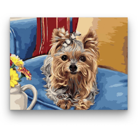 Kis yorki a széken - számfestő készlet – 40×50 cm (Keret nélkül) A festményen egy bájos kis yorki kényelmesen pihen egy széken, melegséget és otthonosságot árasztva. A kép mintha egy csendes délután történetét mesélné el, ahol minden a nyugalomról szól. A