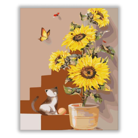 Kiscica napraforgója - számfestő készlet – 40×50 cm (Keret nélkül) A kép melegséget és nyugalmat áraszt, mintha egy csendes délután pillanatait ragadná meg. Egy kiscica figyelmesen nézi a napraforgókat, miközben pillangók táncolnak körülötte, mesebeli han