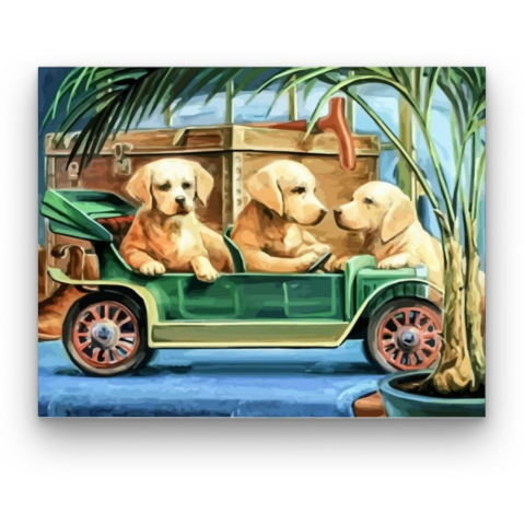 Kiskutyák az autóban - számfestő készlet – 40×50 cm (Keret nélkül) Ez a festmény derűs játékosságot áraszt, amely mosolyt csal az arcokra. A kép központjában egy kedves jelenet bontakozik ki, ahol a kiskutyák kalandra készülnek egy régi autóban. A zöld és