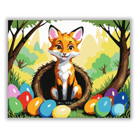 Kisróka Húsvéti Tojásokkal - húsvéti számfestő készlet – 40×50 cm (Keret nélkül) A festmény vidám és játékos hangulatot áraszt, amely azonnal mosolyt csal az arcokra. Egy kedves kisróka történetét meséli el, aki boldogan fedezi fel a húsvéti meglepetéseke