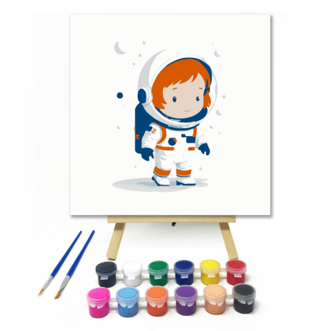 Kíváncsi űrhajós - gyerek számfestő készlet – 20×20 cm (Keret nélkül) Ez a kép egy bátor kis űrhajóst ábrázol, aki kíváncsian nézelődik a csillagok között. A mosolygós űrutazó vidám színei kalandra hívják a gyerekeket. Tökéletes választás a kis felfedezők
