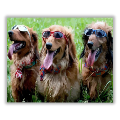 Kutya party - számfestő készlet – 40×50 cm (Keret nélkül) A kép vidám és játékos hangulatot áraszt, amely mosolyt csal a néző arcára. Három kutya, akik mintha egy titkos bulira készülnének, napszemüvegben élvezik a napfényt. A zöld háttér frissességet és