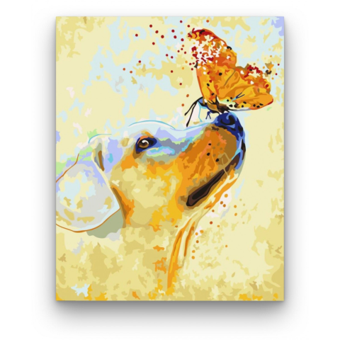 Kutyus és pillangó - számfestő készlet – 40×50 cm (Keret nélkül) A festmény egy játékos és békés világot tár elénk, ahol a pillanat varázsa örök. Egy kutyus és egy pillangó találkozása mesél egy apró csodáról, amely bárhol megtörténhet. A meleg sárga és n
