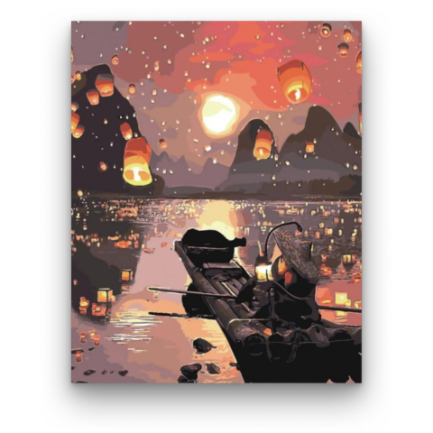 Lámpások - számfestő készlet – 40×50 cm (Keret nélkül) A festmény nyugodt, varázslatos hangulatot áraszt, mintha egy másik világba repítene minket. Egy történet bontakozik ki a néző előtt, ahol a lámpások fényében rejtett titkok várnak felfedezésre. A mel