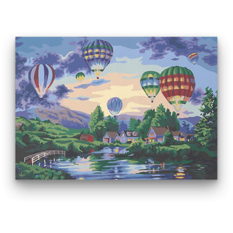Léggömbök Faluja - számfestő készlet – 40×50 cm (Keret nélkül) A festmény elvarázsolja a nézőt egy békés, mesebeli világba, ahol a léggömbök színes tánca tölti meg az eget. A háttérben megbúvó kis falu nyugodt életének pillanatait ragadja meg, miközben a