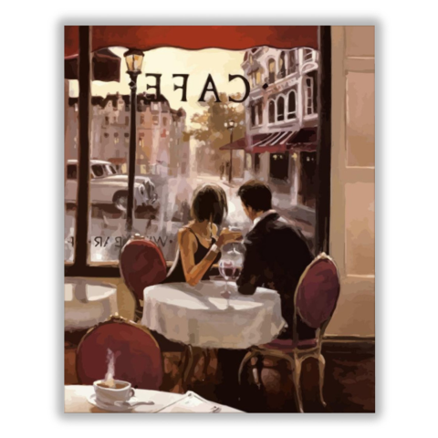 Légyott - számfestő készlet – 40×50 cm (Keret nélkül) A festmény egy romantikus, nosztalgikus hangulatot áraszt, amely magával ragadja a nézőt. Egy kávéházi jelenet bontakozik ki, ahol két ember osztozik egy meghitt pillanaton. A meleg színek és lágy fény
