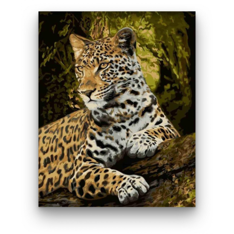 Leopárd tekintet - számfestő készlet – 40×50 cm (Keret nélkül) A festmény egy titokzatos és erőteljes hangulatot áraszt, mintha a nézőt az őserdő mélyére vonzaná. A képen megjelenő történet egy fenséges ragadozóról szól, aki nyugodtan figyeli a környezeté
