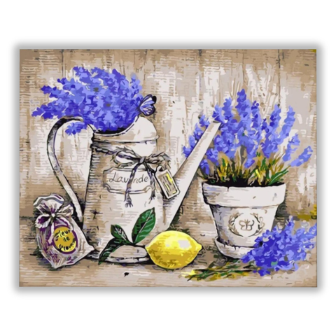 Levendula - számfestő készlet – 40×50 cm (Keret nélkül) A festmény nyugalmat és frissességet áraszt, mintha egy provence-i reggel illata lengené be a teret. A kép története egy varázslatos kertbe vezet, ahol a levendula és a citrom találkozása egy új nap