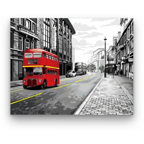 Londoni utca - számfestő készlet – 40×50 cm (Keret nélkül) A kép nyüzsgő városi életérzést kelt, ahol a piros busz élénk színe kiemelkedik a fekete-fehér háttérből. Egy történet bontakozik ki, ahol a mindennapi élet sodrása találkozik a múlt és jelen harm