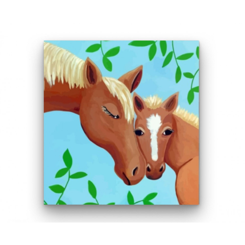 Lovak - gyerek számfestő készlet – 20×20 cm (Keret nélkül) Ez a bájos képecske két barátságos lovacskát mutat, akik békésen pihennek a zöld levelek között. A ragyogó kék ég és a meleg barna árnyalatok vidám hangulatot árasztanak. Tökéletes választás a gye