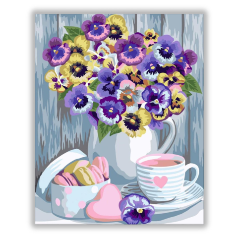 Macaron teával - számfestő készlet – 40×50 cm (Keret nélkül) Ez a festmény egy meghitt délután varázsát idézi meg, ahol a csendes nyugalom ölel körül. A finom részletek mesélnek egy pillanatról, amely tele van illatokkal és ízekkel. A pasztell színek és a