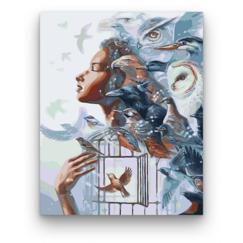 Madarak szabadsága - számfestő készlet – 40×50 cm (Keret nélkül) A festmény megkapóan szabad érzést kelt, mintha a lélek könnyedén szárnyalna. Egy történet bontakozik ki, ahol a szabadság és az önkifejezés találkozik. A kék és barna árnyalatok harmóniája