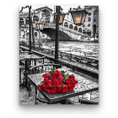 Magányos rózsacsokor - számfestő készlet – 40×50 cm (Keret nélkül) Ez a festmény egy elhagyatott kávézóasztalnál hagyott rózsacsokor magával ragadó hangulatát árasztja. A háttérben meghúzódó híd és a folyó sejtelmesen mesél egy elfeledett találkozásról. A