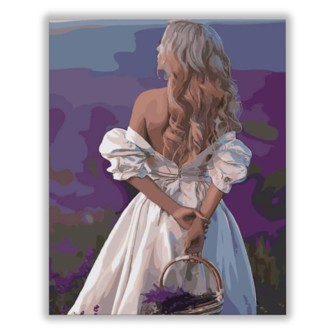 Mátka - számfestő készlet – 40×50 cm (Keret nélkül) A festmény egy romantikus hangulatot áraszt, amely elvarázsolja a nézőt. Egy női alak áll a kép középpontjában, háttal a nézőnek, mintha egy titokzatos történet részese lenne. A lila és kék árnyalatok lá