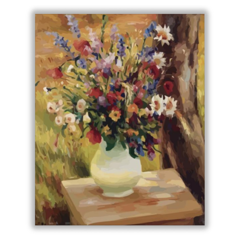 Mezei virágok - számfestő készlet – 40×50 cm (Keret nélkül) A festmény meleg, nyári hangulatot áraszt, amely azonnal magával ragadja a nézőt. Egy elhagyatott kerti asztalon álló virágcsokor meséli el a természet csendes szépségét. A színek élénk harmóniáj