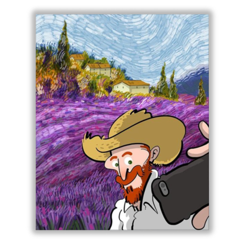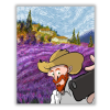 Modern Vincent - számfestő készlet – 40×50 cm (Keret nélkül) A kép vidám és játékos hangulatot áraszt, amely mosolyt csal a néző arcára. Egy történet bontakozik ki, ahol a régi idők találkoznak a modern technológiával egy festői táj közepén. Az élénk lila
