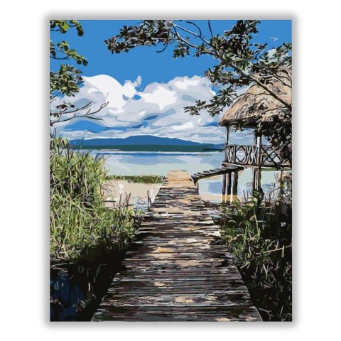 Móló - számfestő készlet – 40×50 cm (Keret nélkül) A festmény egy békés nyári délutánt idéz, ahol a tengerparti móló hívogatóan nyúlik a távoli horizontra. A kép mögött rejtőző történet egy csendes menedéket sejtet, ahol a természet és az ember alkotta vi
