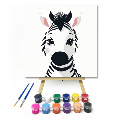 Mosolygós kis zebra - gyerek számfestő készlet – 20×20 cm (Keret nélkül) Ez a kép egy mosolygós kis zebrát ábrázol, aki vidáman néz ránk a vászonról. A fekete-fehér csíkjai mellett a barátságos arcocskája kelti életre a festményt. Tökéletes választás a gy
