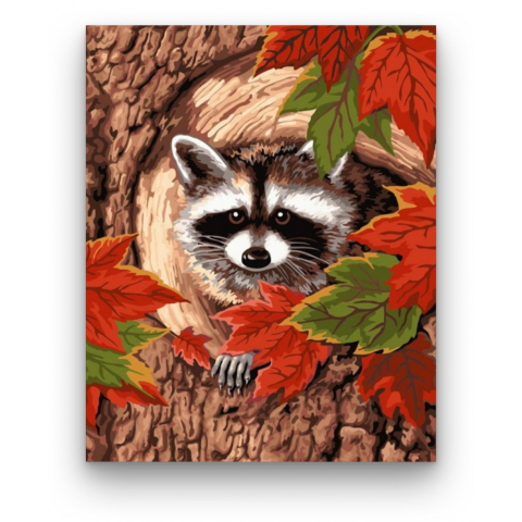 Mosómedve a fán - számfestő készlet – 40×50 cm (Keret nélkül) A kép melegséget és kíváncsiságot áraszt, ahogy a mosómedve óvatosan kikukucskál a fa odújából. Egy mesebeli történet bontakozik ki, ahol az őszi levelek között rejtőzik egy titokzatos világ. A