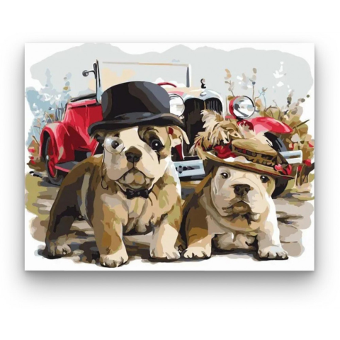 Mr. és Mrs. Bulldog - számfestő készlet – 40×50 cm (Keret nélkül) Ez a bájos festmény mosolyt csal az arcodra, ahogy a két elegáns bulldog egy régi autó előtt pózol. A jelenet egy különleges utazásra hív, ahol a múlt eleganciája és a kutyák játékos jellem