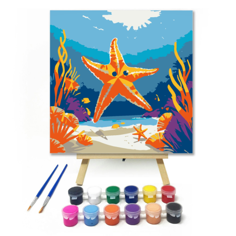 Napfény az óceánban - gyerek számfestő készlet – 20×20 cm (Keret nélkül) Ez a kép egy vidám tengeri csillagot ábrázol, aki boldogan úszik az óceán kékjében, körülötte színes korallokkal és halacskákkal. A napfényes színek örömteli hangulatot varázsolnak a