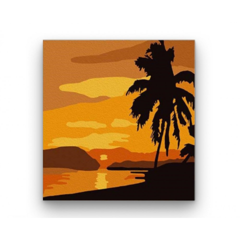 Napnyugta - gyerek számfestő készlet – 20×20 cm (Keret nélkül) Ez a kép egy varázslatos napnyugtát ábrázol, ahol a nap aranysárga fényei megcsillannak a nyugodt vízen, miközben egy pálmafa sziluettje köszönti az estét. A meleg narancs és barna árnyalatok