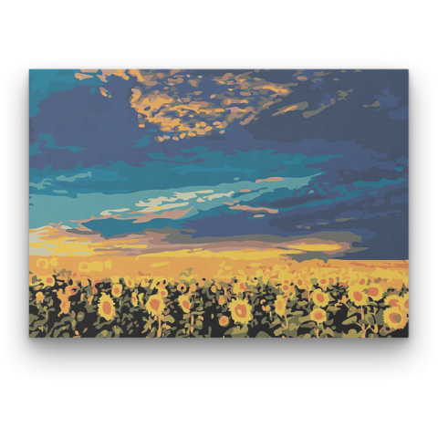 Napraforgó Föld - számfestő készlet – 40×50 cm (Keret nélkül) A festmény egy varázslatos naplementét ábrázol, amely a nézőt egy nyugodt, békés világba repíti. A napraforgók tengerén átívelő fények és árnyékok saját történetüket mesélik el a természet szép