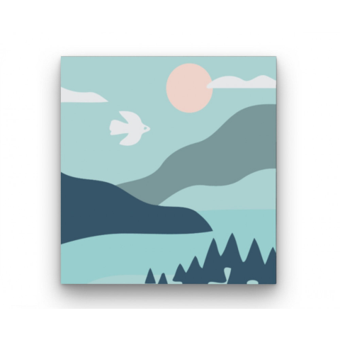 Napsütés - gyerek számfestő készlet – 20×20 cm (Keret nélkül) Ez a kép egy varázslatos tájat ábrázol, ahol a nap kedvesen mosolyog a hegyek fölött, miközben egy madárka vidáman röppen az égen. A lágy kék és zöld árnyalatok megnyugtató hangulatot teremtene