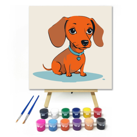Narancsos kutyus - gyerek számfestő készlet – 20×20 cm (Keret nélkül) Ez a kép egy bájos, narancssárga kutyust ábrázol, aki vidáman üldögél és várja, hogy életre keljen a színekkel. A barátságos kék nyakörv és a meleg narancs színek mosolyt csalnak minden