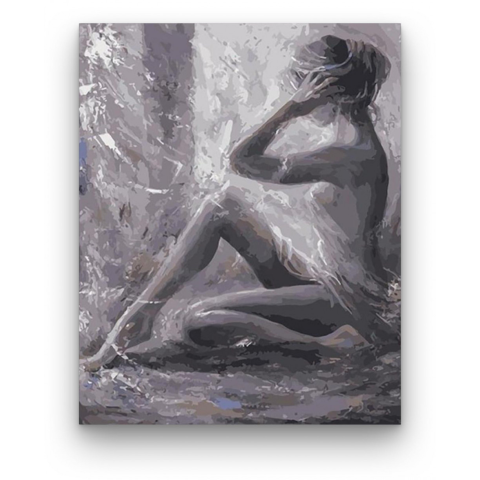 Női test - számfestő készlet – 40×50 cm (Keret nélkül) A festmény csendes melankóliát áraszt, amely mély gondolatokba meríti a nézőt. Egy történet bontakozik ki a kép előtt, ahol a test mozdulata és helyzete érzelmeket közvetít. A monokróm színek és az ár