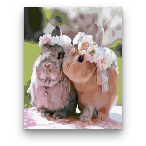 Nyuszi pár - számfestő készlet – 40×50 cm (Keret nélkül) Ez a festmény bájos nyugalmat áraszt, amely azonnal mosolyt csal az arcodra. A két összebújó nyuszi mintha egy titkos történetet mesélne el a barátságról és szeretetről. A lágy pasztellszínek és a f